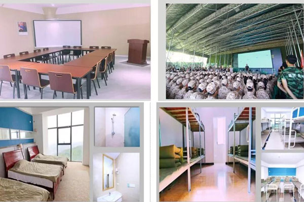 綦江古剑山研学体验实践基地拥有标准化宿舍,拓展设施齐全,有标准化军事训练场、器械训练场、会操训练场地、标准运动场地,还设有大礼堂、多媒体会议室等,可完成学生军训,企业员工军训,魔鬼式训练等不同军训类科目。